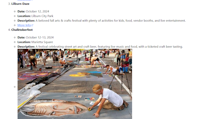 Use python to get today's date and then use it to find things to do in Atlanta for each of the next four weekends with pictures and correct links from FindAnswers.