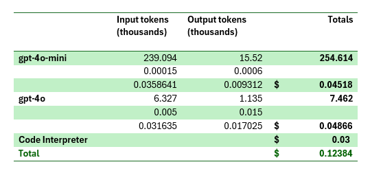 Using mostly gpt-4o-mini keeps costs down. The single call to gpt-4o cost almost as much as 40 calls to gpt-4o-mini!