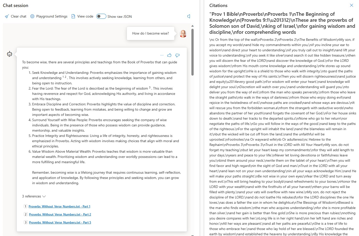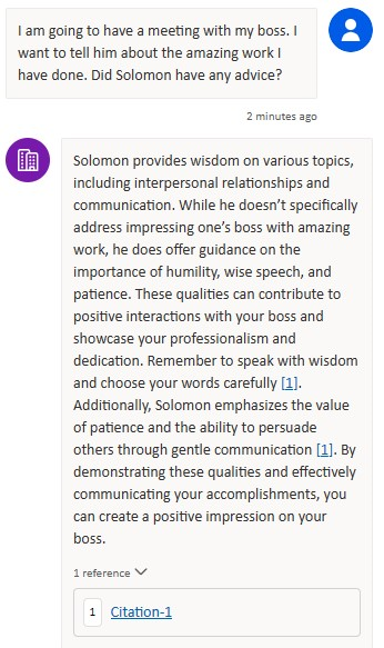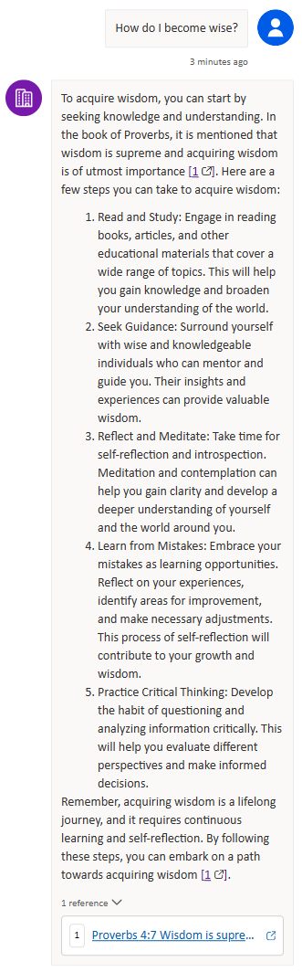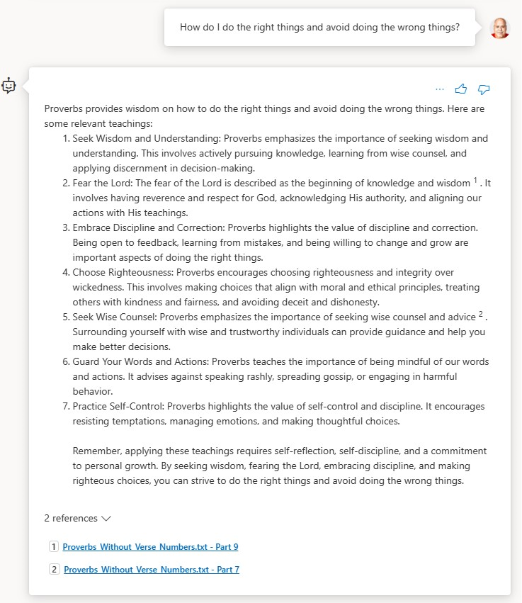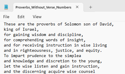 The example I will use throughout the remainder of the article is a chatbot grounded in The Book of Proverbs, the text of which I got from BibleHub.com. I like using this as an example for several reasons: