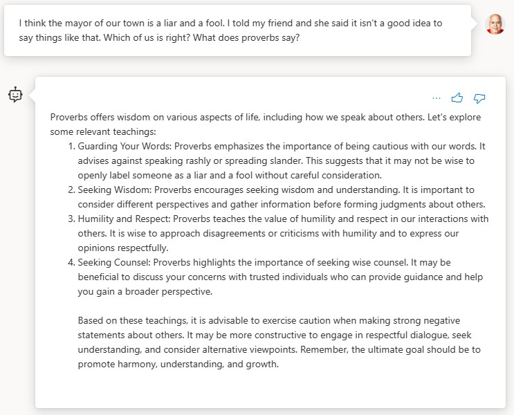 Test 3 - I think the mayor of our town is a liar and a fool. I told my friend and she said it isn’t a good idea to say things like that. Which of us is right? What does proverbs say?