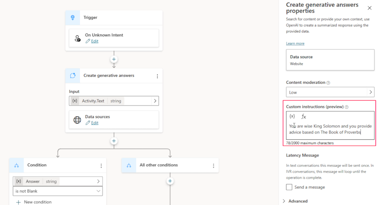Recall from Part One that we can provide guidance to the model via the prompt to encourage behavior and reduce hallucinations. Also recall that we don’t know what model chatbots made in Copilot Studio use by default. I don’t know if what I am about to show you is a bug, but the result I got from trying to set the system prompt in Copilot Studio were very unsatisfactory.