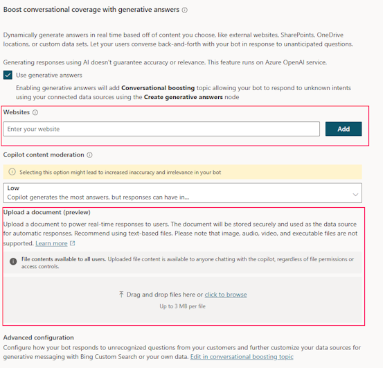 Once Generative AI is enabled in the Copilot, you can connect it to data for retrieval within limits for no additional charge and without needing to set anything else up. Two options are websites and document upload.