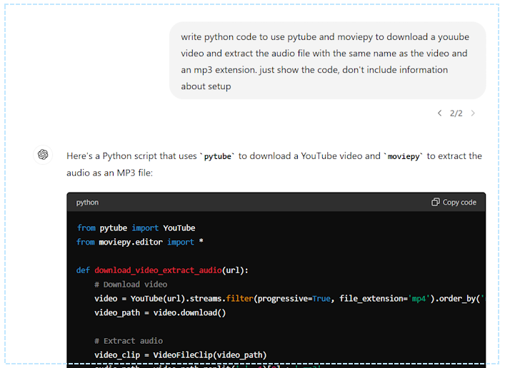 I use moviepy to easily extract the audio track. Pytube and moviepy are venerable and popular, and ChatGPT has no trouble writing code using them.