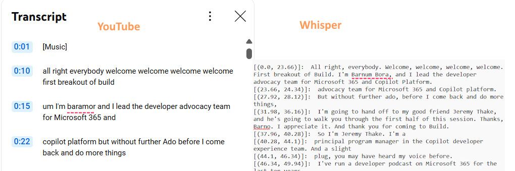 The test video I am using is Developer’s Guide to Customizing Microsoft Copilot - Microsoft Build 2024. I chose it because it was a great presentation, because Jeremy has an accent, and because Barnam and Jeremy introduced themselves and said their names! It’s funny what you notice when you start looking for specific information, but often people forget to introduce themselves.