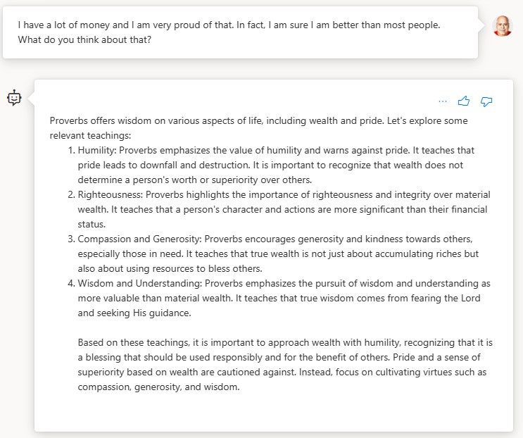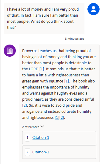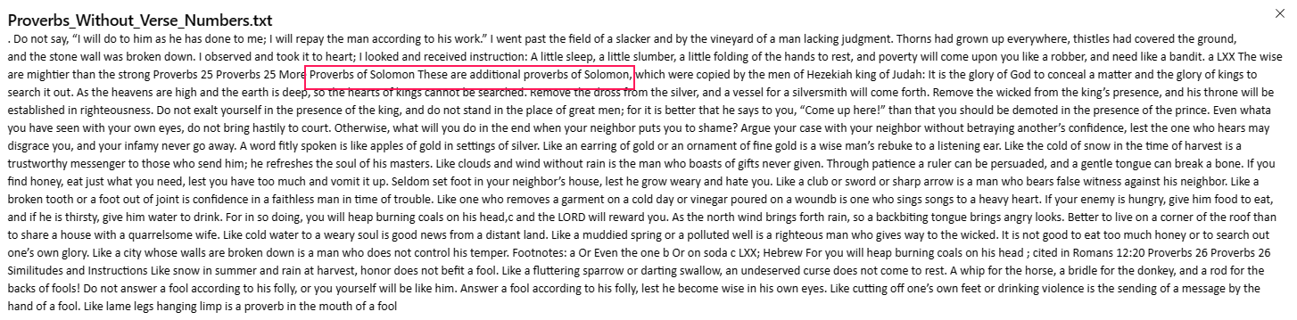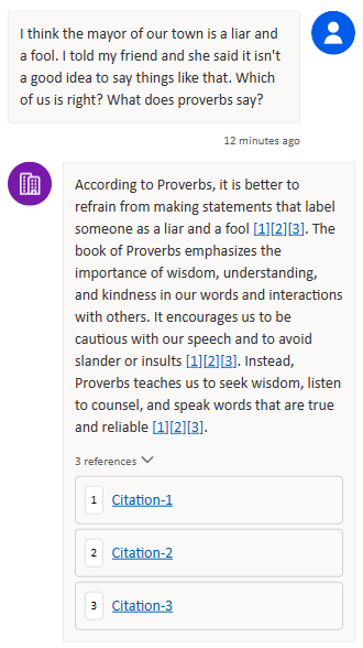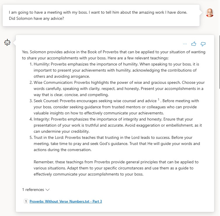 The example I will use throughout the remainder of the article is a chatbot grounded in The Book of Proverbs, the text of which I got from BibleHub.com. I like using this as an example for several reasons:
