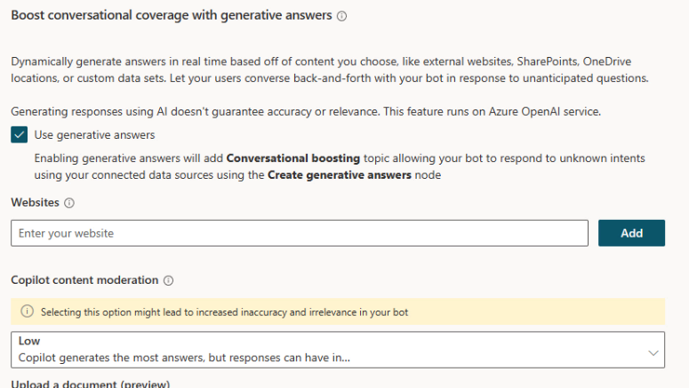 Once Generative AI is enabled in the Copilot, you can connect it to data for retrieval within limits for no additional charge and without needing to set anything else up. Two options are websites and document upload.