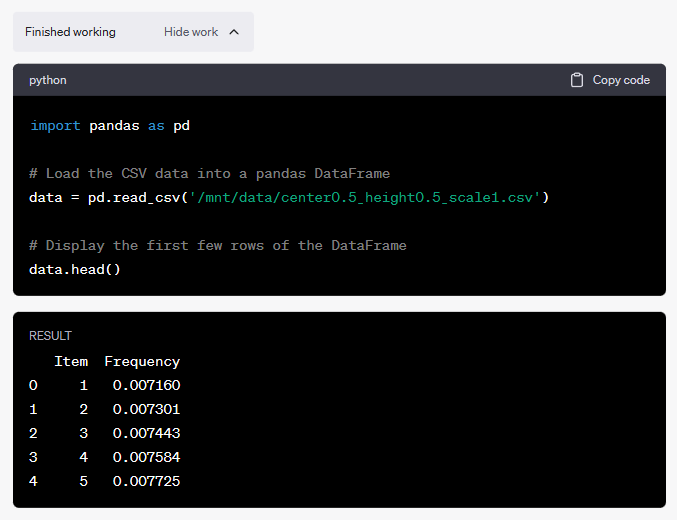 My Weighted Randoms sample project contains a Jupyter notebook for visualization of the data in the various csv files. Code Interpreter can do the same.