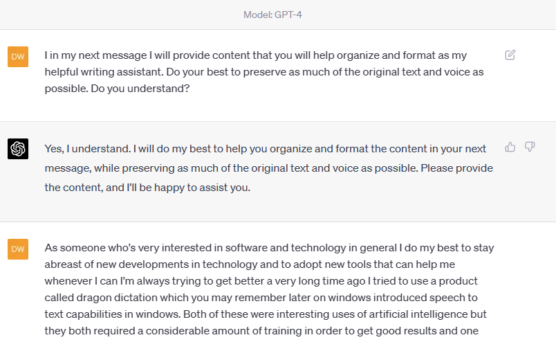 I have to say that the first cut of the. What I’m saying to Microsoft Word is is showing up in this document pretty well. It’s fairly well capitalized, but it has some of my stop words in it and. It’s, you know, a little haphazard in terms of my thinking. Um, So what? I’m. Trying to tell you is that I don’t. Really worry about that. And I don’t need to really worry about that because I’m gonna take this. Intermediate product which is pretty rough. And I’m going to give it to ChatGPT and ask it to clean it up for me. Divided up into sections. And then? Add the text back into the sections, but I’m going to explicitly tell it that I want to preserve as much of the original text and voice as possible. Because I’m not asking ChatGPT to write an article for me. I’m asking you to help me write an article. I’m not asking ChatGPT to put words in my mouth. I’m asking ChatGPT to use my words. I’ll take the results of that and pass it through the rest of my workflow, which will let me do some formatting and add images using some PowerShell tools that are in this associated GitHub repository. And I’m going to write an article about those specifically soon and how to use them. Um, but in the meantime? This is the point in my article where I’m going to stop using, uh, the Dictate button in Microsoft Word, and I’m going to let ChatGPT clean it up. In the final post I’ll put links to this original file so you can see what it looks like, as well as what ChatGPT produced and of course. If you’re reading this article, you know what the final product actually looked like, how it turned out the other end. OK, so. I now have one page of text in Word. And I spent. Maybe 5 minutes. Dictating the words to create the first draft.