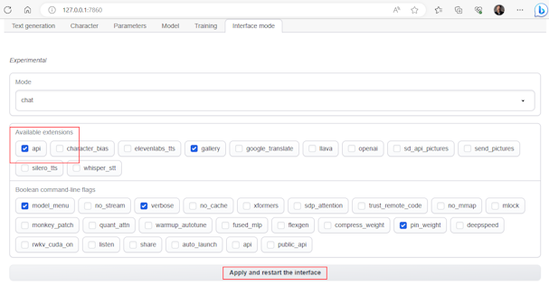 First start Text Generation Web UI and enable the api extension.