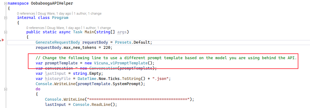 OobaboogaAPIHelper is a .NET library available on nuget.org. This class library makes it easy to consume the Oobabooga Text Generation Web UI’s API extension. Key features include: prompt templates for Vicuna 1,0, 1.1, Dolly v2, and basic LLama with a base class that is easy to extend, converstaion helpers to easily convert saved converstaions created with one model and/or prompt template for use with other models, model parameters and presets, and token counting to make it easy to fit your model’s context size limits.