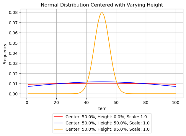 The WeightedRandomSelection class provides a powerful method for selecting an item from a list based on a weighted random selection algorithm. It utilizes a normal distribution to assign weights to each item, which can be customized by adjusting the peak position, center height, and standard deviation scaling factor of the curve.