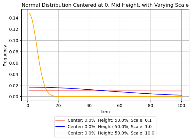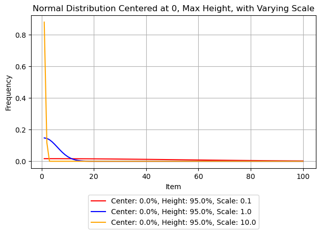 Another way to use the algorithm is to change the standard deviation by applying a scale factor. The first series (red) shows a curve where the scale is very small, 0.1. This has the effect of flattening the curve even when the height is set to the maximum. The last series (yellow) shows a curve where items in the center are the only items with any chance of being selected.